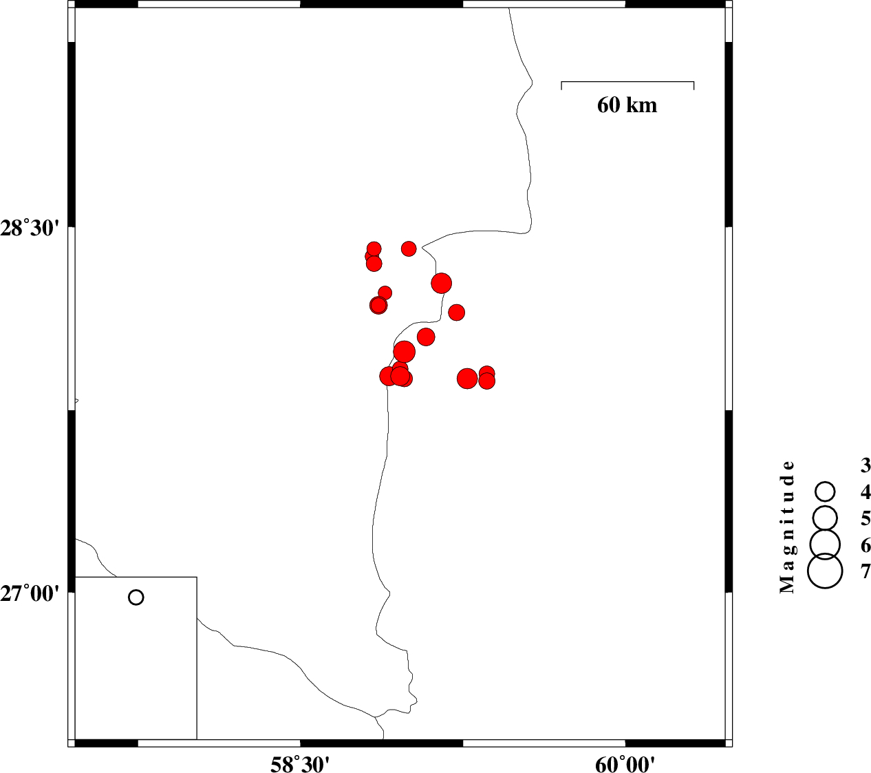 2011/04/11 12:02:15.3 16:32:15.3 27.8958.9115 ML4 Sistan va Baloochestan Province, 120 km East of Kahnuj