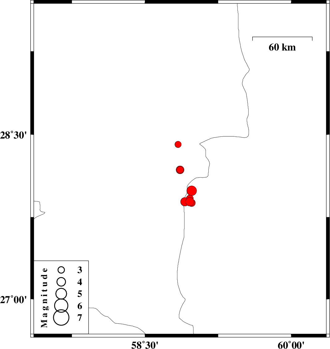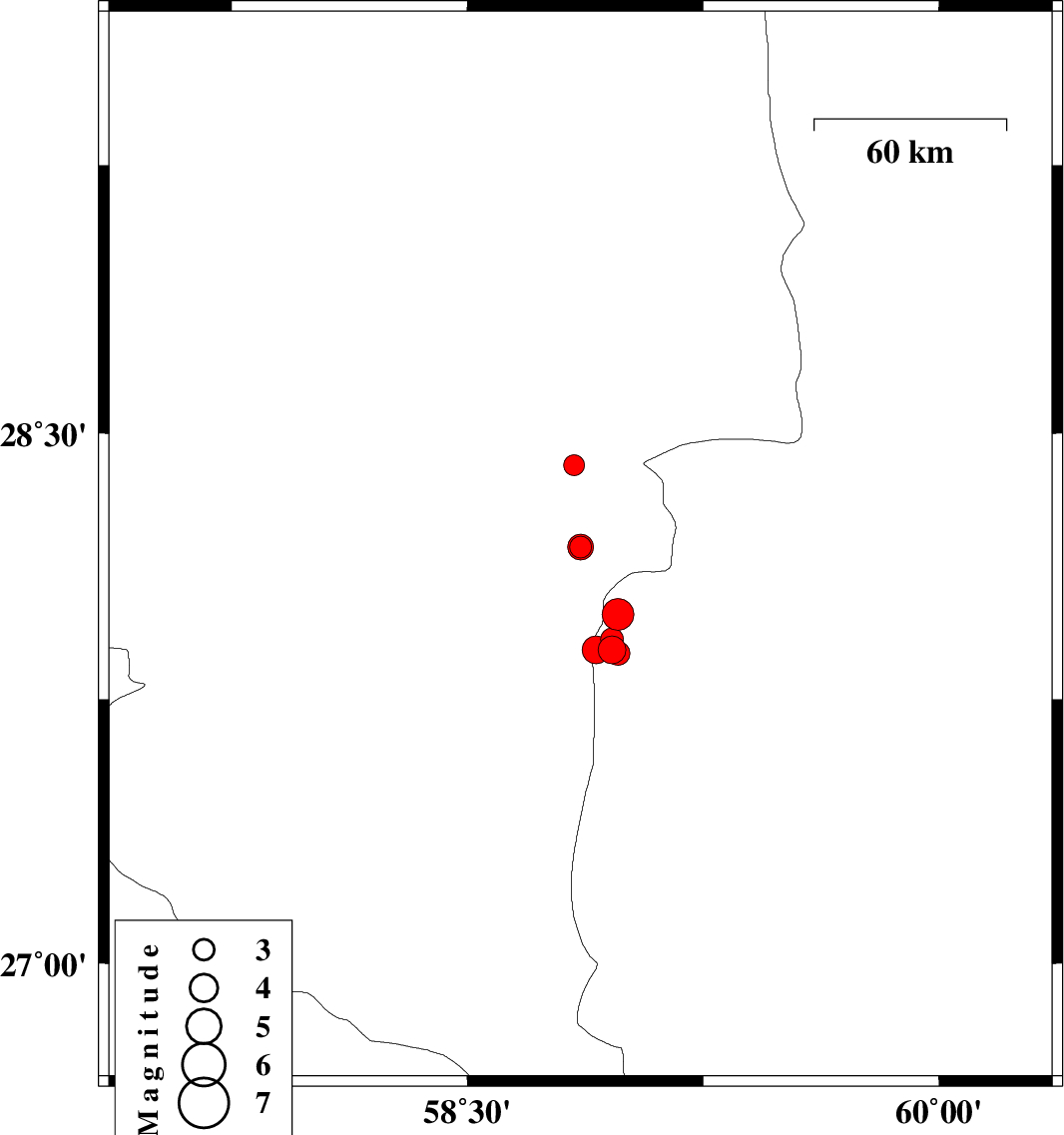 | 2011/04/11 | 12:02:15.3 | 16:32:15.3 | 27.89 | 58.91 | 15 | ML4 | Sistan va Baloochestan Province, 120 km East of Kahnuj | ||