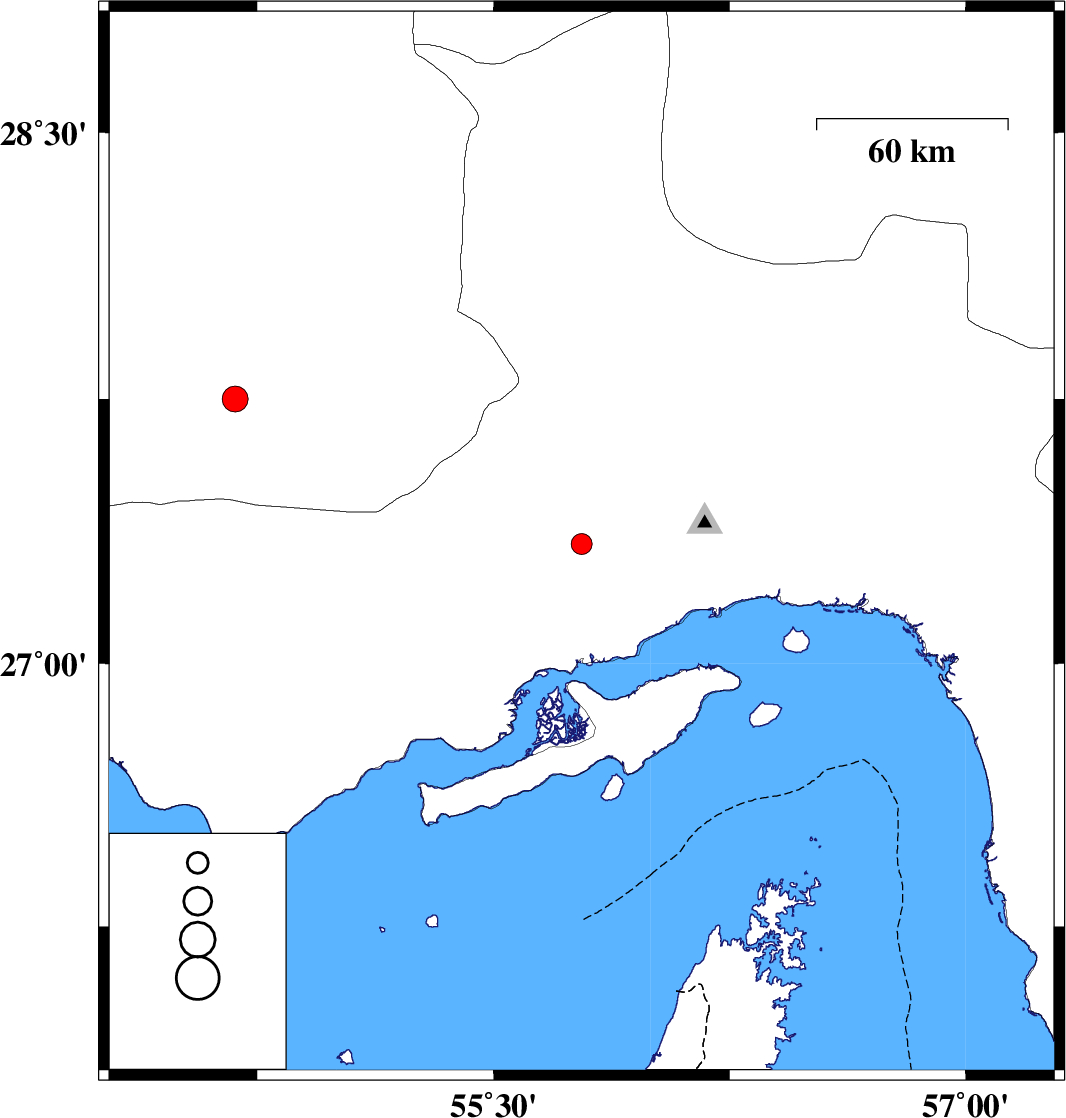 | 2011/04/20 | 16:20:35.6 | 20:50:35.6 | 27.34 | 55.78 | 14 | ML2.9 | Hormozgan Province, 53 km North-West of Bandar-e abbas | ||