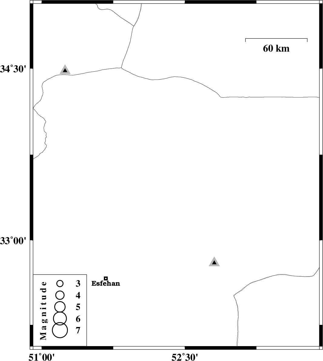 | 2011/04/21 | 21:23:40.9 | 01:53:40.9 | 33.56 | 52.41 | 15 | ML3.8 | Esfahan Province, 20 km North of Ardestan |