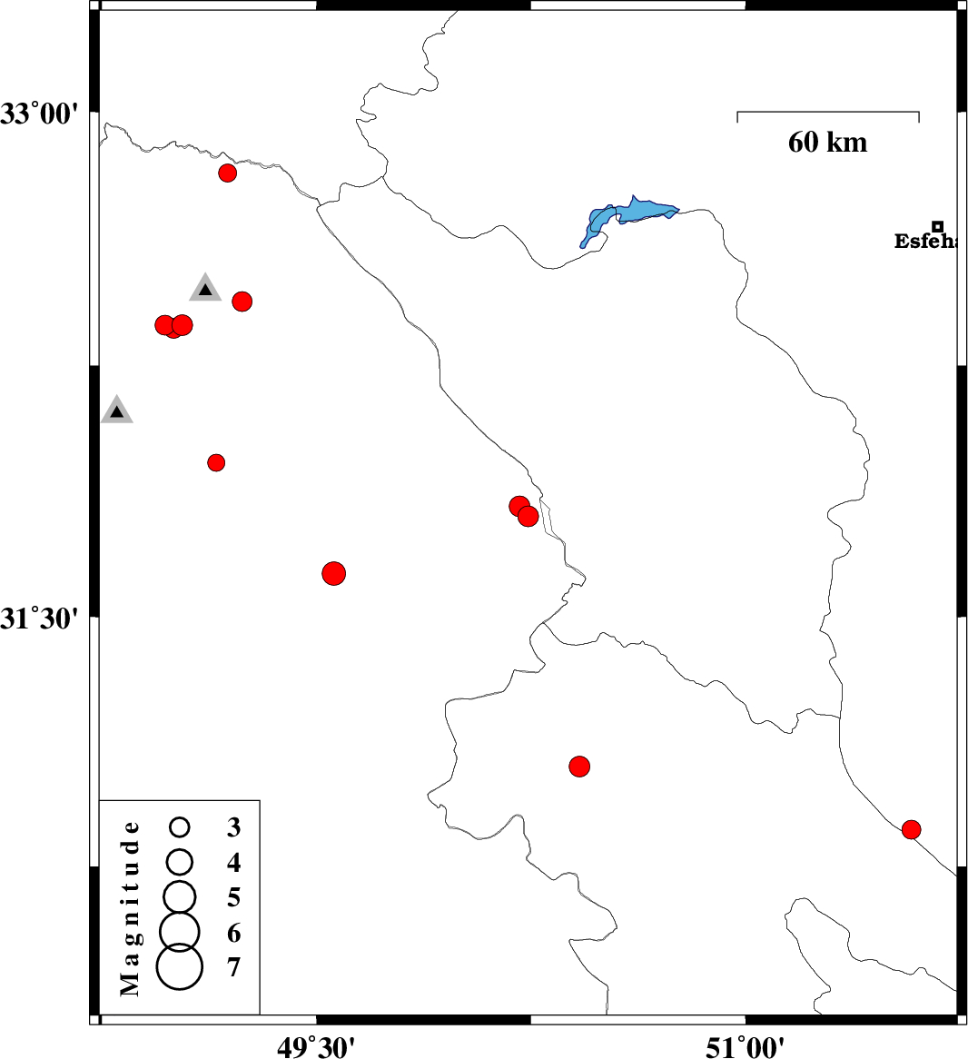 | 2011/04/19 | 15:43:13.6 | 20:13:13.6 | 31.63 | 49.56 | 14 | ML3.7 | Khoozestan Province, 39 km North of Ramhormoz | ||