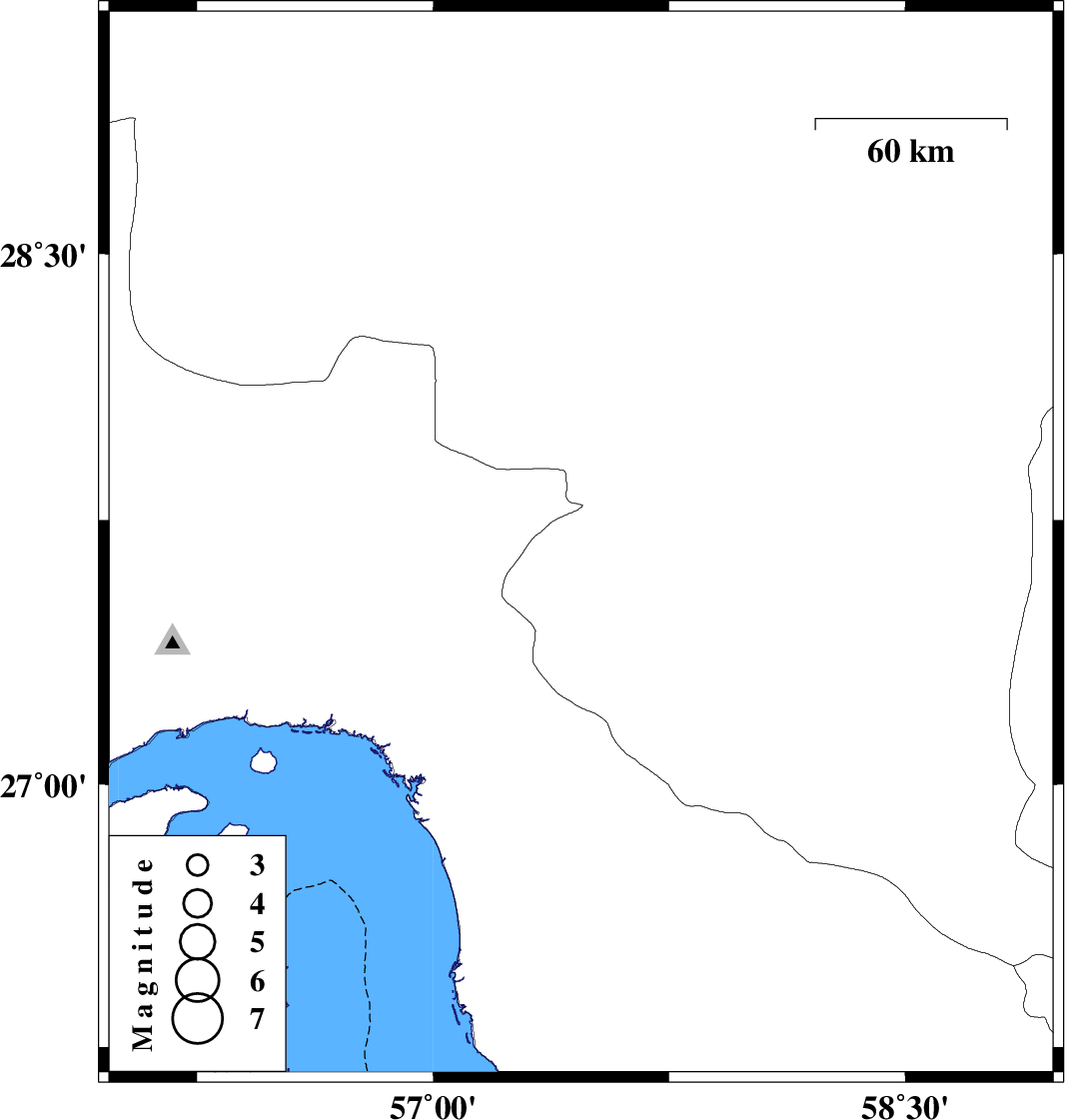 | 2011/04/26 | 20:11:02.6 | 00:41:02.6 | 27.68 | 57.47 | 35 | ML2.8 | Kerman Province, 30 km North of Manujan |