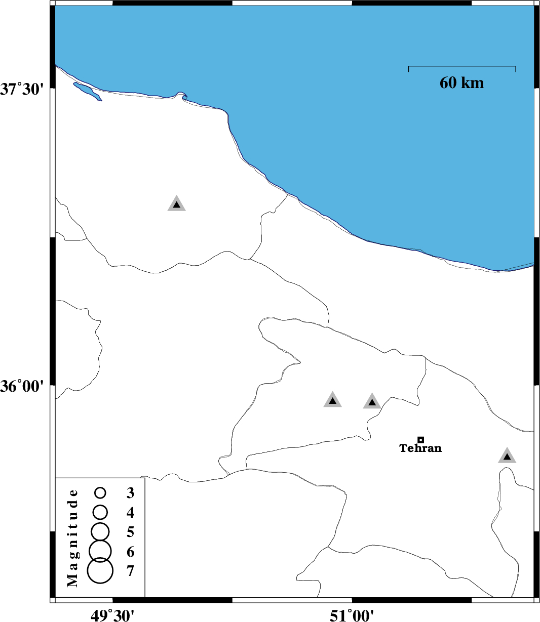 | 2011/04/28 | 04:21:35.2 | 08:51:35.2 | 36.41 | 50.64 | 14 | ML2.8 | Ghazvin Province, 43 km North-East of Abyek |