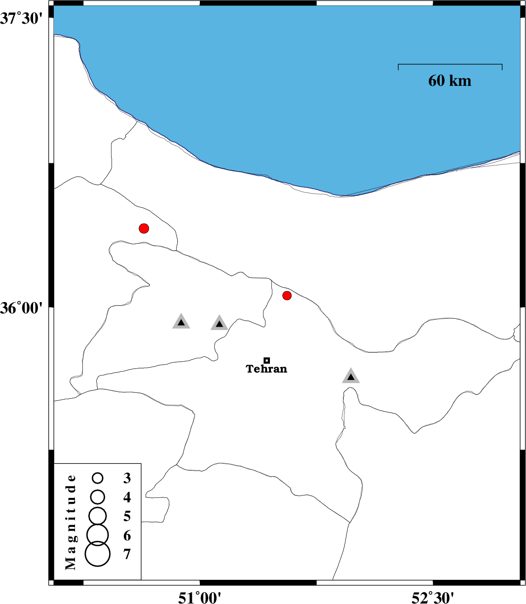| 2011/04/30 | 07:18:39.5 | 11:48:39.5 | 36.06 | 51.56 | 16 | ML2.6 | Tehran Province, 31 km North-East of Tajrish | ||