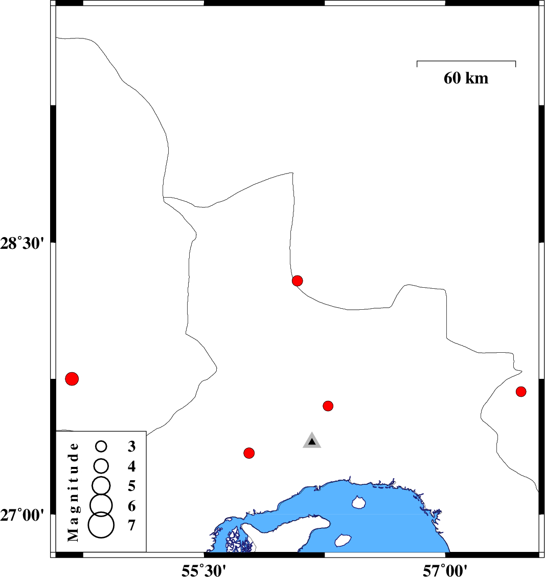 | 2011/04/05 | 22:57:42.9 | 03:27:42.9 | 27.6 | 56.27 | 14 | ML2.8 | Hormozgan Province, 46 km North of Bandar-e abbas |