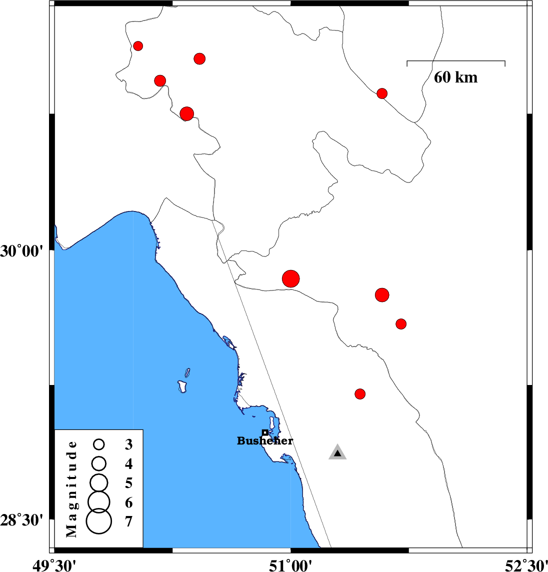 | 2011/04/18 | 23:39:14.8 | 04:09:14.8 | 29.2 | 51.44 | 44 | ML2.9 | Bushehr Province, 24 km East of Borazjan | ||
