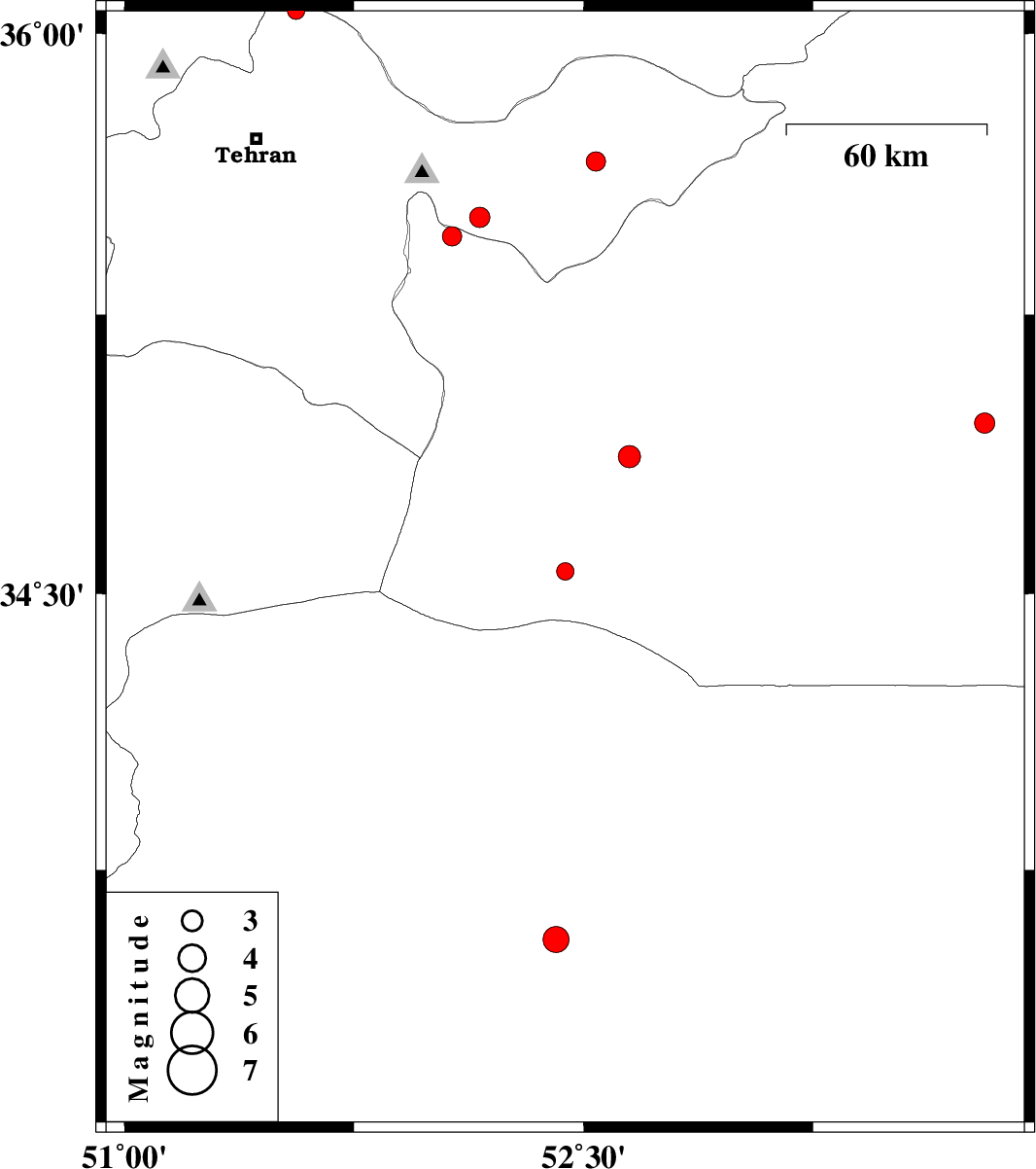 | 2011/04/30 | 07:18:39.5 | 11:48:39.5 | 36.06 | 51.56 | 16 | ML2.6 | Tehran Province, 31 km North-East of Tajrish | ||