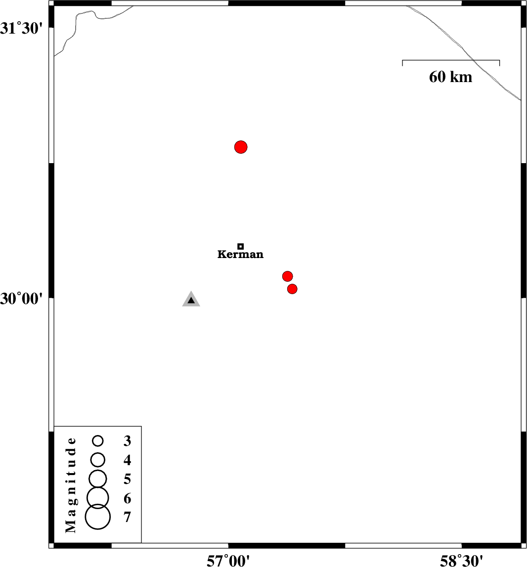 | 2011/05/11 | 20:14:48.5 | 00:44:48.5 | 30.12 | 57.38 | 6 | ML3 | Kerman Province, 35 km South-East of Kerman | ||
