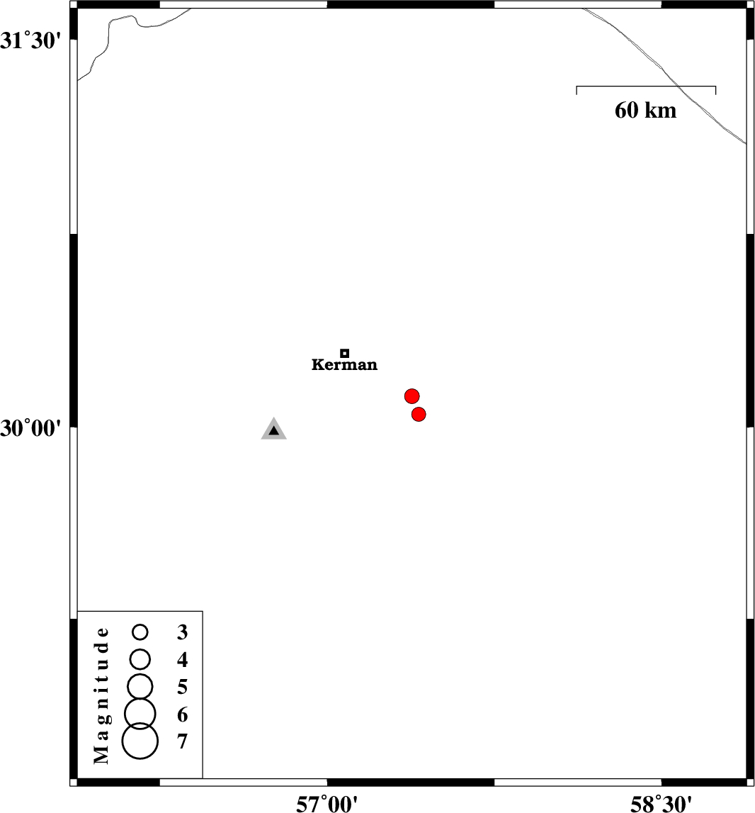 | 2011/05/11 | 20:14:48.5 | 00:44:48.5 | 30.12 | 57.38 | 6 | ML3 | Kerman Province, 35 km South-East of Kerman |