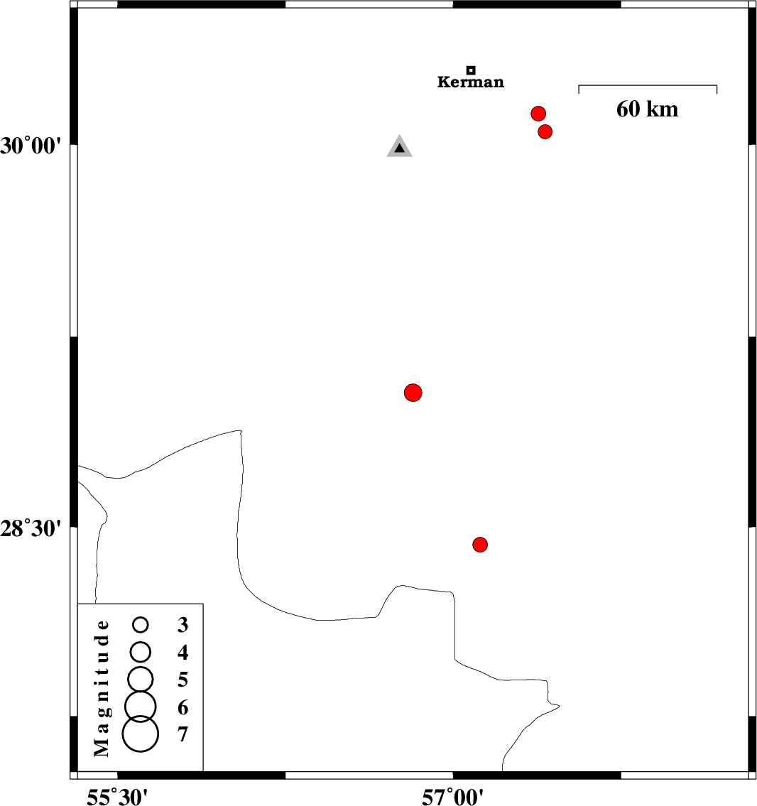 | 2011/05/07 | 14:15:56.8 | 18:45:56.8 | 28.43 | 57.12 | 15 | ML3 | Kerman Province, 66 km South-West of Jiroft |