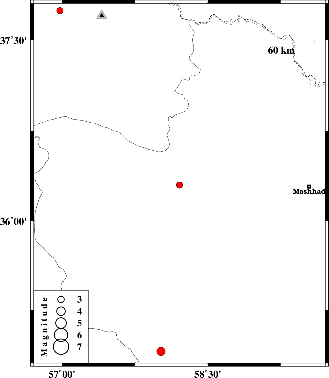 | 2011/04/23 | 08:00:50.6 | 12:30:50.6 | 34.9 | 58.02 | 41 | ML4 | Khorasan(center) Province, 40 km South of Bardeskan |