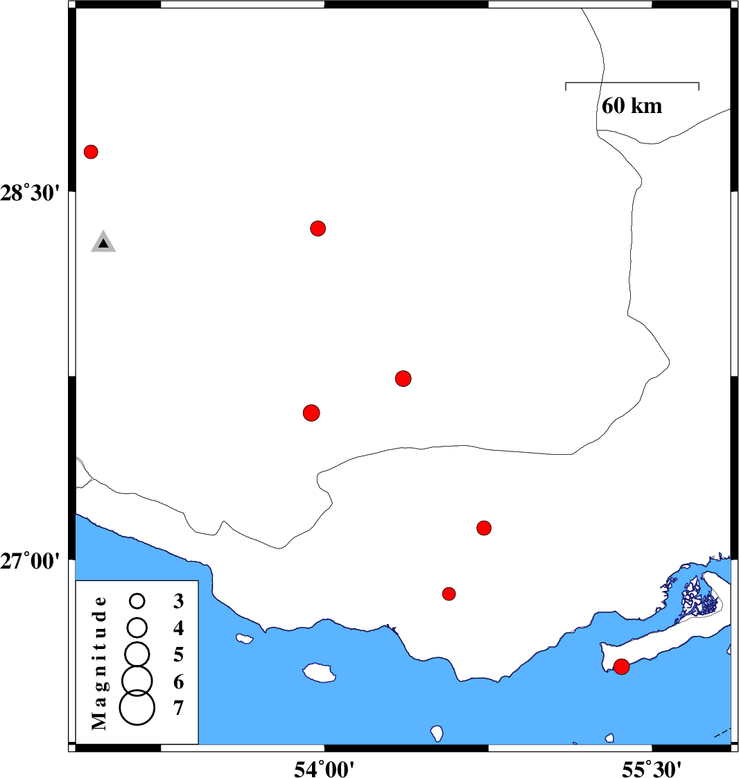 | 2011/04/26 | 01:43:25.3 | 06:13:25.3 | 26.56 | 55.36 | 27 | ML3.2 | Persian Gulf, 51 km East of Bandar-e lengeh |