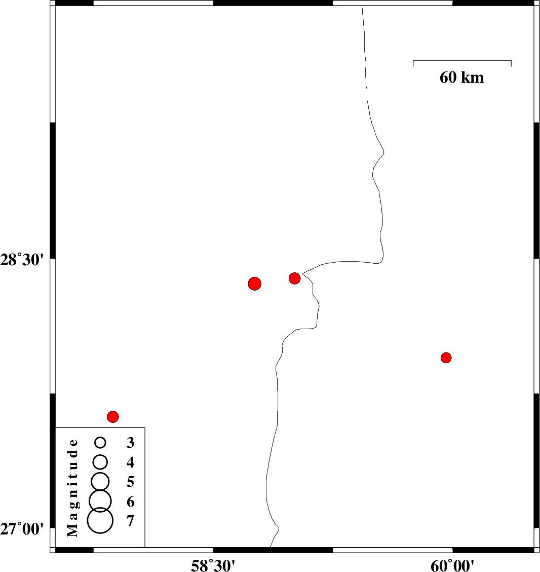 | 2011/05/06 | 15:28:11.1 | 19:58:11.1 | 27.95 | 59.96 | 17 | ML3 | Sistan va Baloochestan Province, 109 km North-West of Iranshahr |