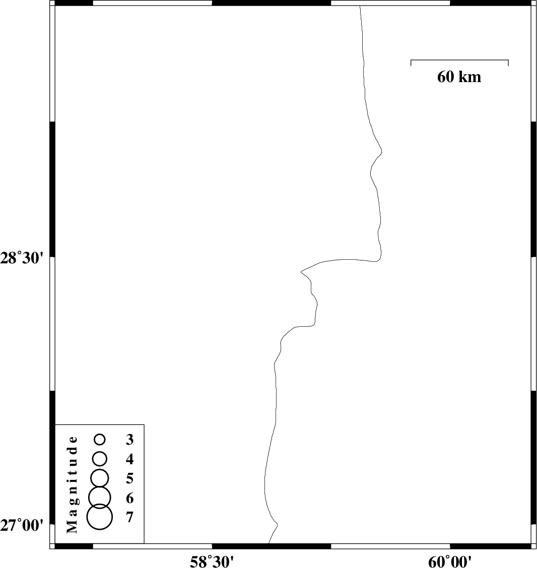 | 2011/05/24 | 16:16:24.0 | 20:46:24.0 | 28.39 | 59.01 | 14 | ML3.2 | Kerman Province, 102 km South-East of Bam |