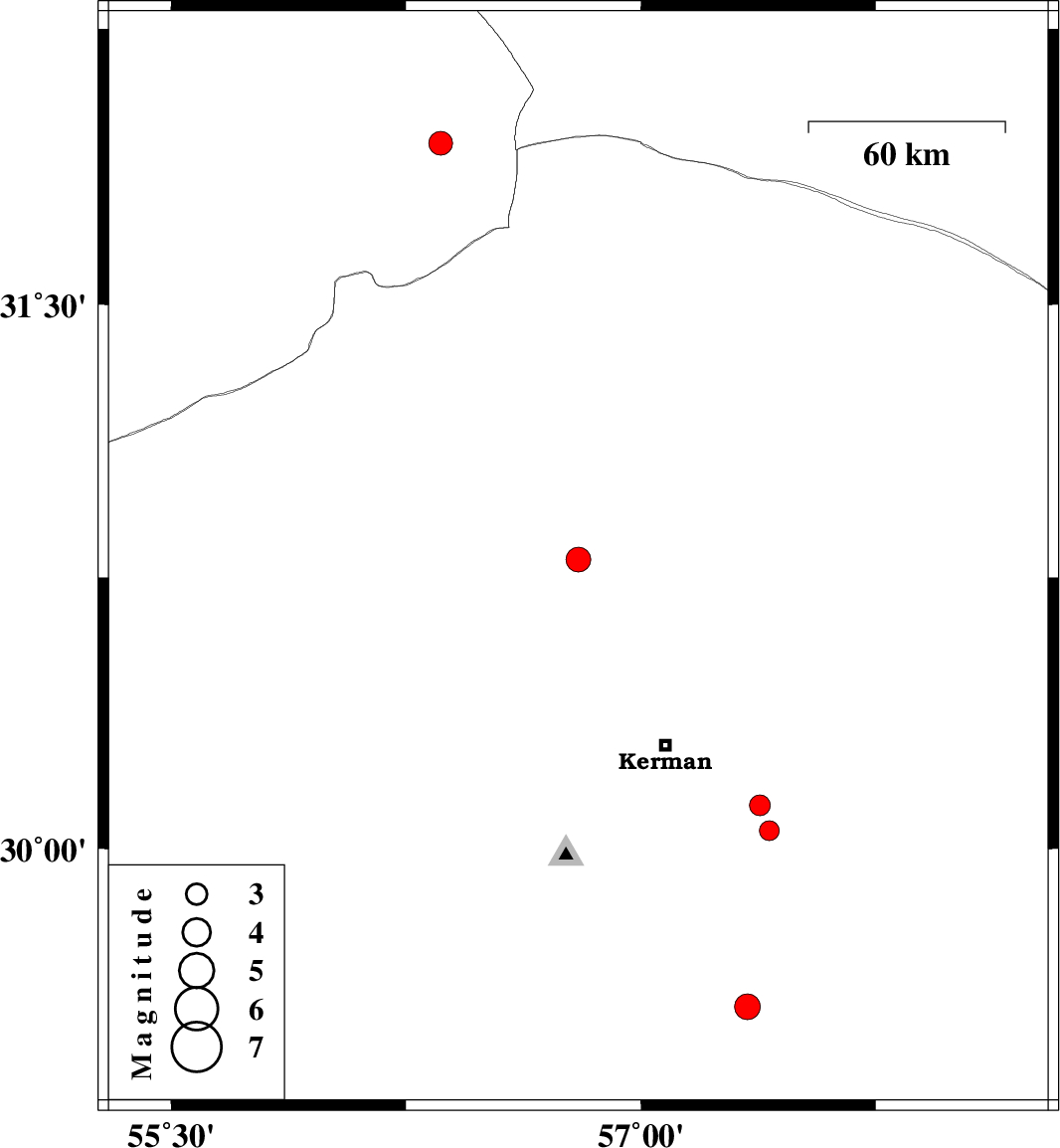 | 2011/05/11 | 20:14:48.5 | 00:44:48.5 | 30.12 | 57.38 | 6 | ML3 | Kerman Province, 35 km South-East of Kerman |