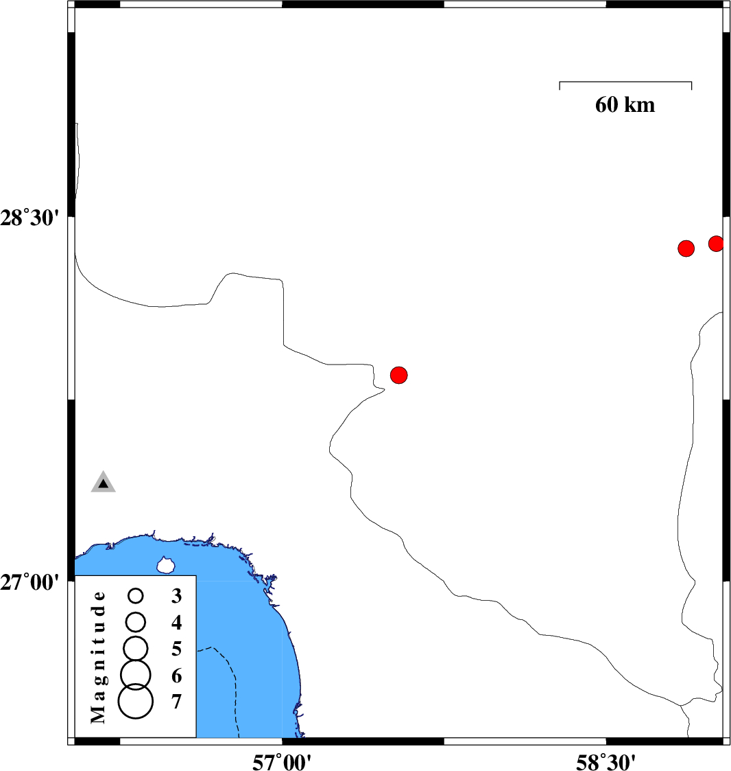 | 2011/05/31 | 13:45:18.9 | 18:15:18.9 | 27.85 | 57.54 | 14 | ML3.5 | Kerman Province, 18 km West of Kahnuj | ||