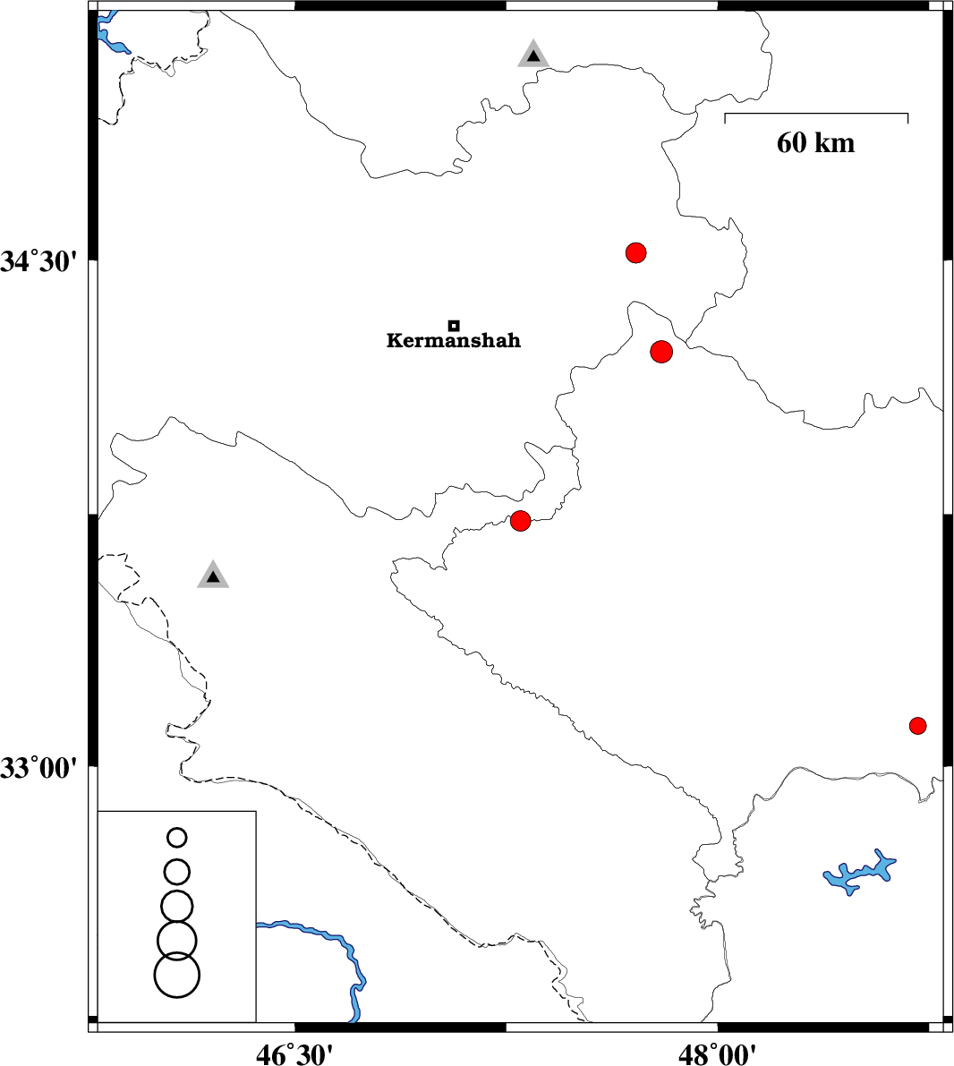 | 2011/06/01 | 17:18:33.6 | 21:48:33.6 | 33.73 | 47.3 | 17 | ML3.2 | Ilam Province, 36 km North-West of Kuhdasht | ||