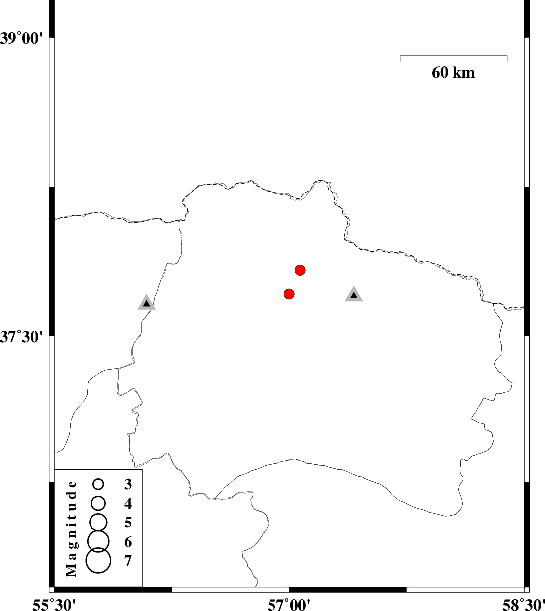 | 2011/06/04 | 21:45:54.2 | 02:15:54.2 | 37.83 | 57.07 | 42 | ML3 | Khorasan(north) Province, 33 km North-East of Ashkhaneh |