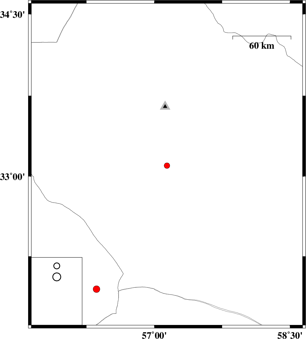 | 2011/06/11 | 02:49:18.5 | 07:19:18.5 | 33.1 | 57.14 | 14 | ML2.8 | Yazd Province, 59 km South-East of Tabas | ||