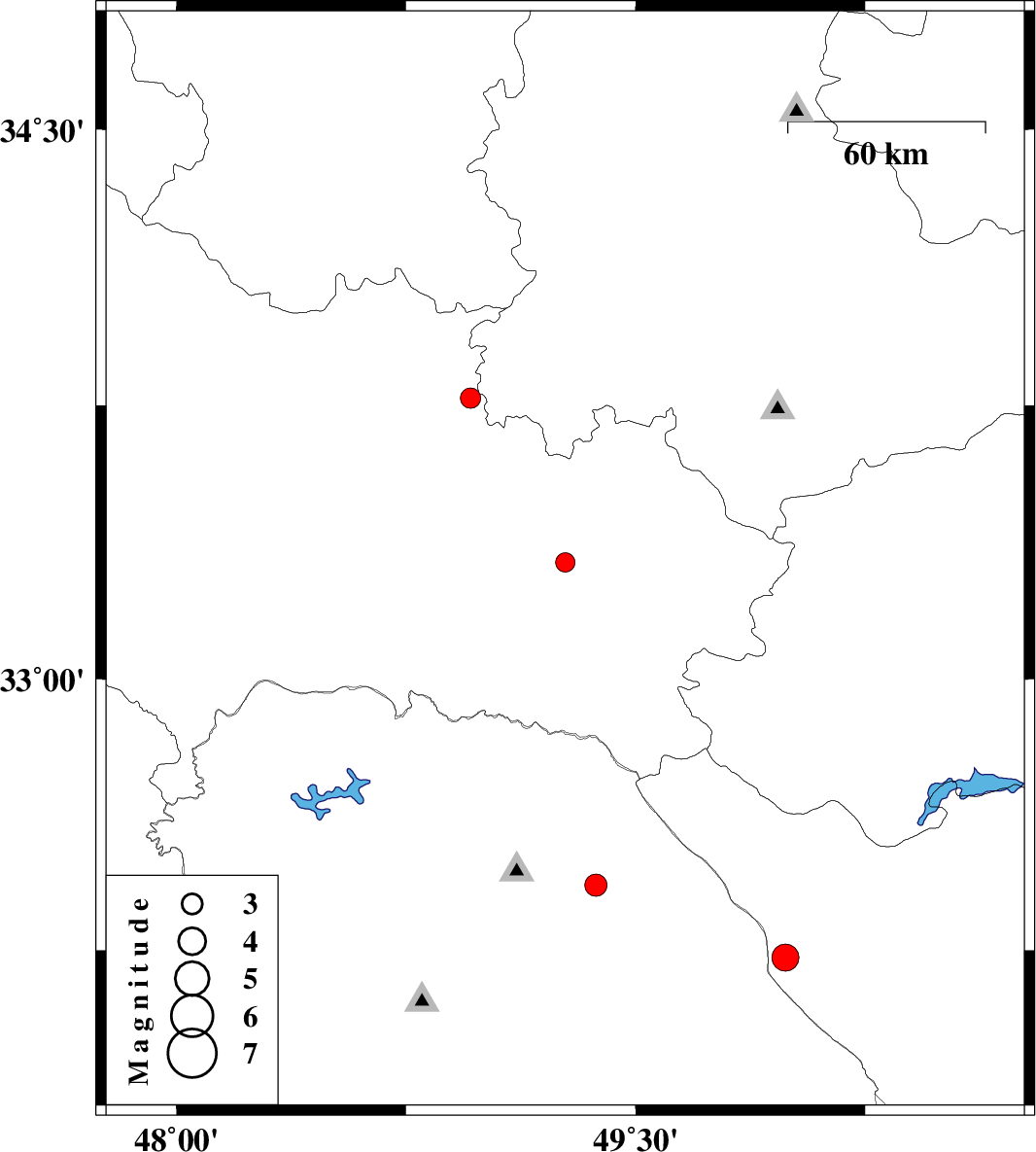 | 2011/06/09 | 10:13:13.1 | 14:43:13.1 | 32.23 | 49.99 | 15 | ML4 | Chaharmahal Bakhtiari Province, 29 km South-West of Chelgard |