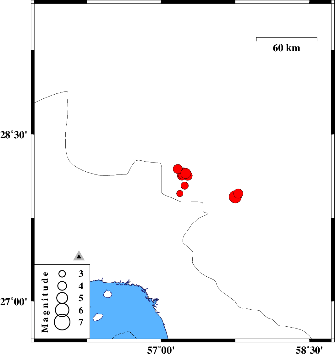 2011/06/15 05:09:00.9 09:39:00.9 27.9757.1945 ML3 Kerman Province, 49 km West of Kahnuj