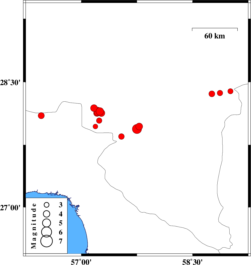 2011/06/15 05:09:00.9 09:39:00.9 27.9757.1945 ML3 Kerman Province, 49 km West of Kahnuj