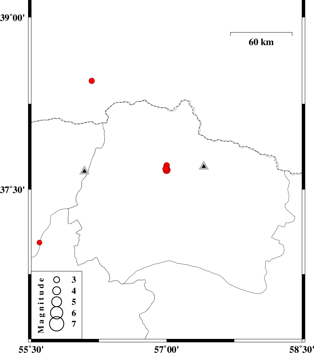 | 2011/06/10 | 02:11:19.9 | 06:41:19.9 | 37.71 | 57 | 14 | ML3 | Khorasan(north) Province, 18 km North of Ashkhaneh |