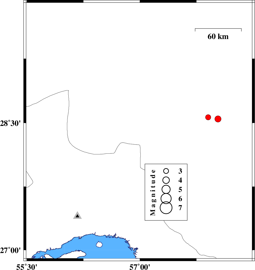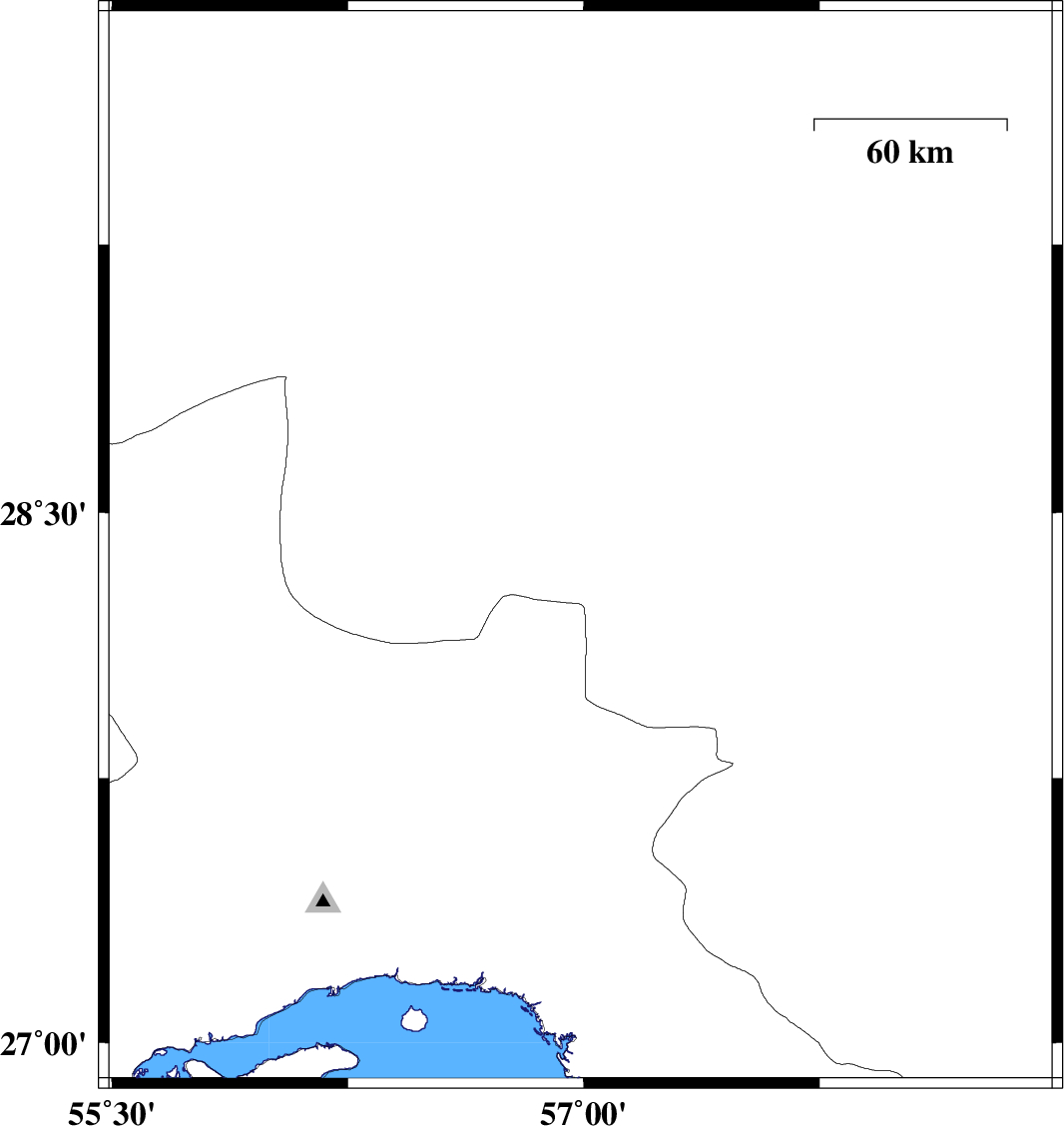 | 2011/06/15 | 01:15:17.4 | 05:45:17.4 | 28.13 | 57.21 | 15 | ML4.1 | Kerman Province, 52 km North-West of Kahnuj | ||