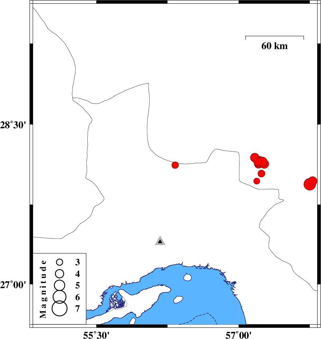 | 2011/06/15 | 01:15:17.4 | 05:45:17.4 | 28.13 | 57.21 | 15 | ML4.1 | Kerman Province, 52 km North-West of Kahnuj | ||