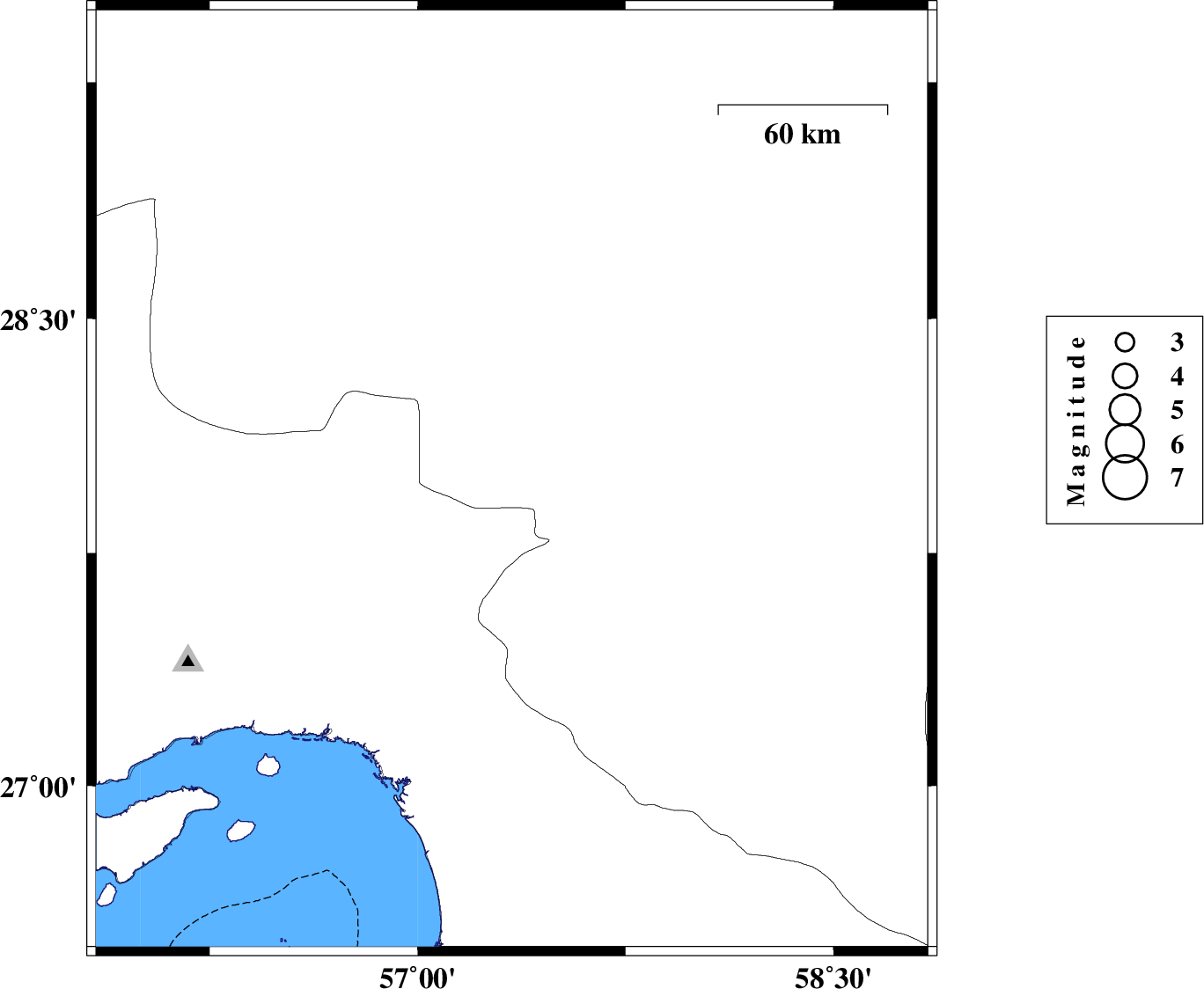 | 2011/06/15 | 01:15:17.4 | 05:45:17.4 | 28.13 | 57.21 | 15 | ML4.1 | Kerman Province, 52 km North-West of Kahnuj | ||