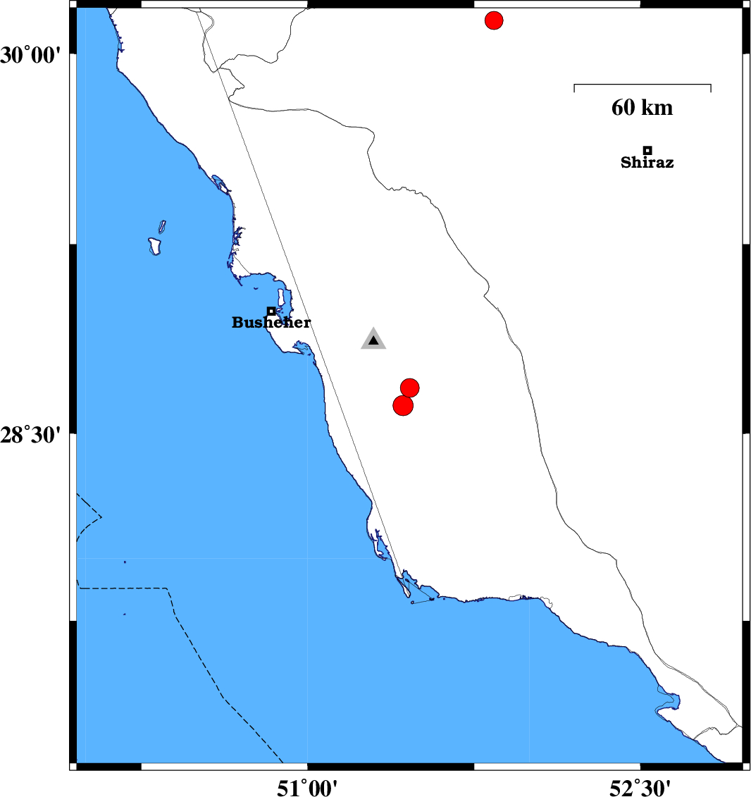 | 2011/07/02 | 01:10:40.2 | 05:40:40.2 | 28.68 | 51.46 | 30 | ML3.8 | Bushehr Province, 9 km Khormog | ||