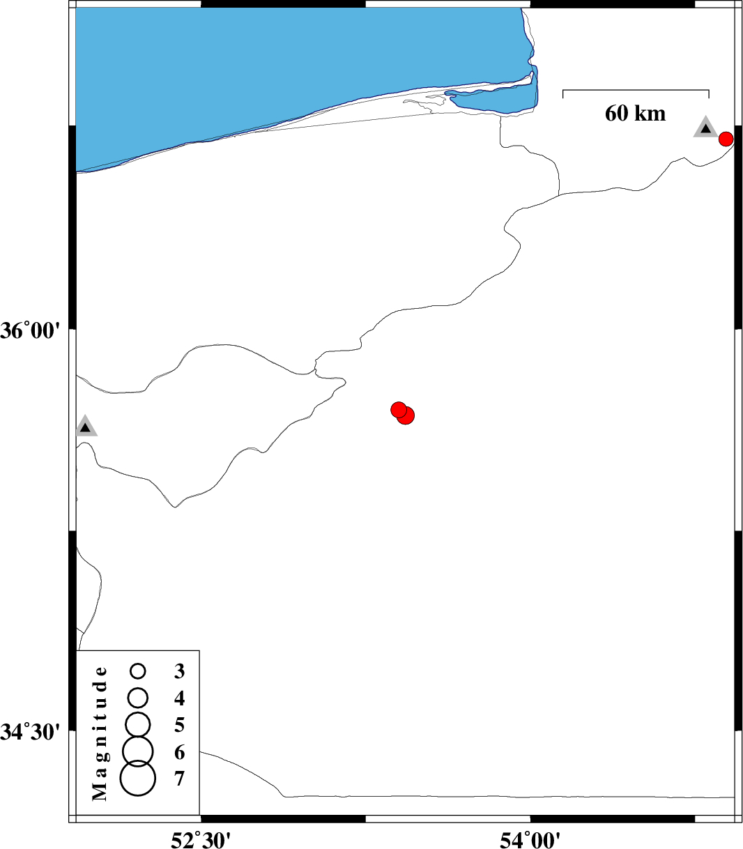 | 2011/07/03 | 19:01:23.7 | 23:31:23.7 | 35.7 | 53.4 | 6 | ML3.3 | Semnan Province, 15 km North of Semnan | ||