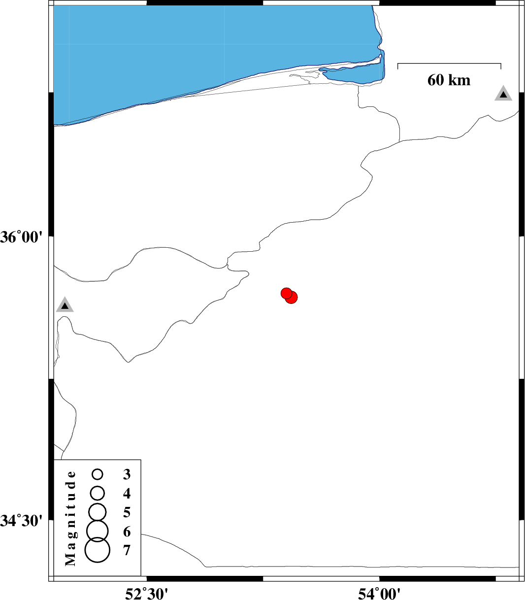 | 2011/07/03 | 19:01:23.7 | 23:31:23.7 | 35.7 | 53.4 | 6 | ML3.3 | Semnan Province, 15 km North of Semnan | ||