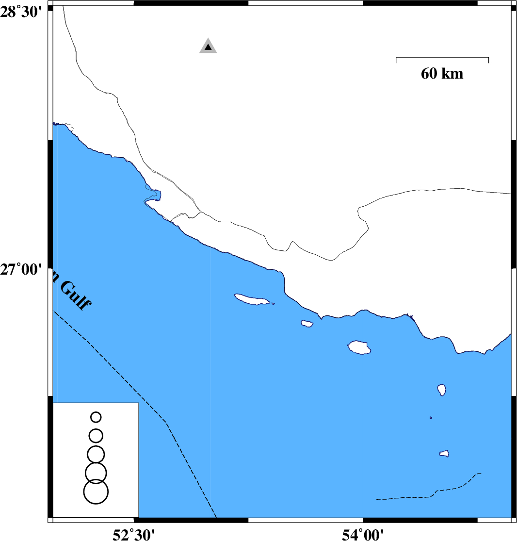 | 2011/07/08 | 13:10:55.6 | 17:40:55.6 | 27.03 | 53.47 | 37 | ML3.4 | Hormozgan Province, 45 km South-East of Lamerd |