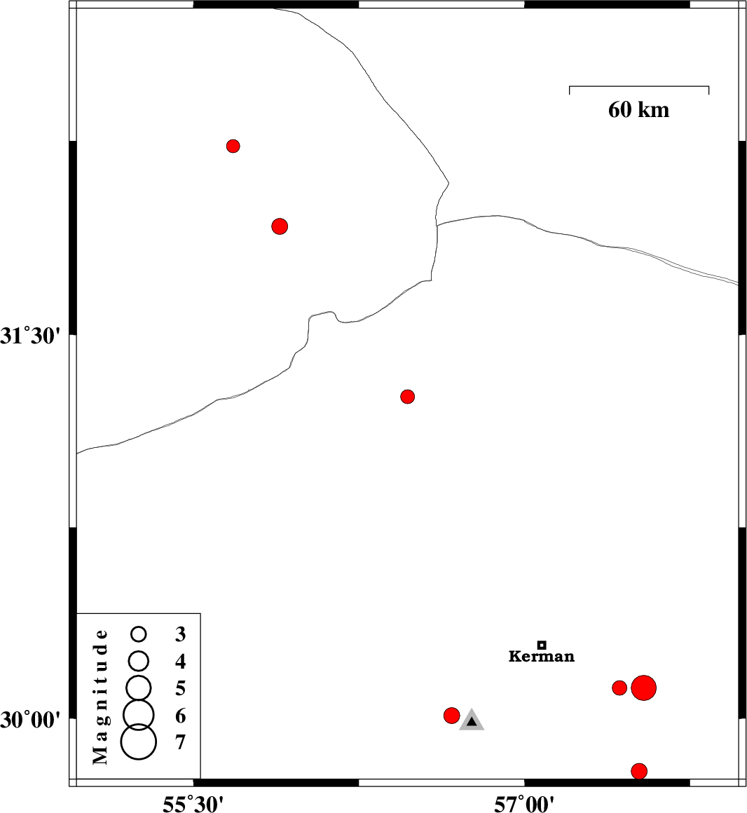 | 2011/06/26 | 09:50:28.0 | 14:20:28.0 | 29.79 | 57.52 | 9 | ML3.3 | Kerman Province, 70 km South-East of Kerman |