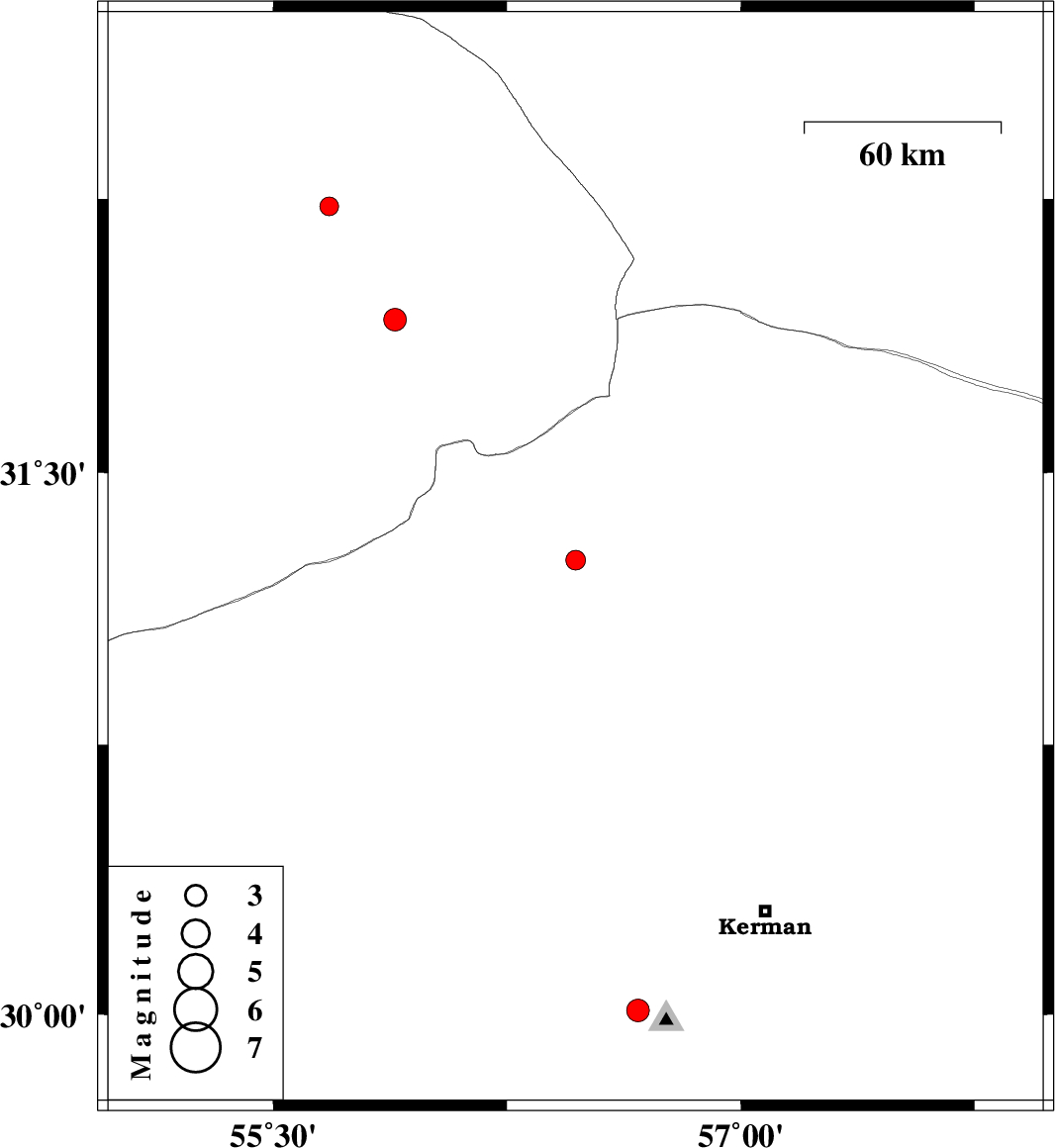| 2011/07/09 | 06:47:39.3 | 11:17:39.3 | 30.01 | 56.67 | 26 | ML3.3 | Kerman Province, 13 km Bardsir | ||