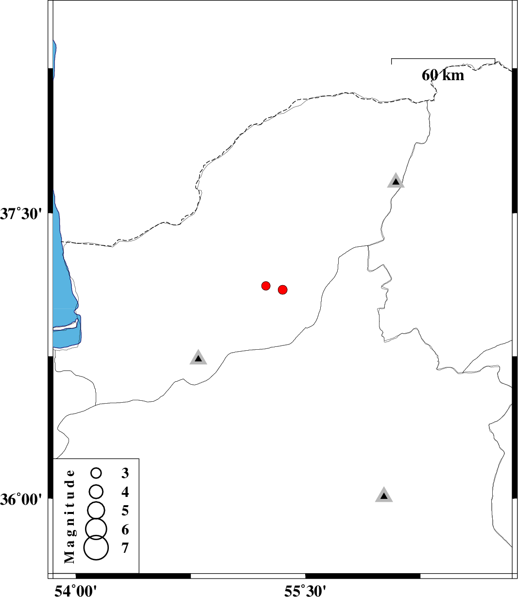 | 2011/07/09 | 03:26:53.1 | 07:56:53.1 | 37.1 | 55.35 | 15 | ML2.7 | Golestan Province, 15 km South of Minodasht |