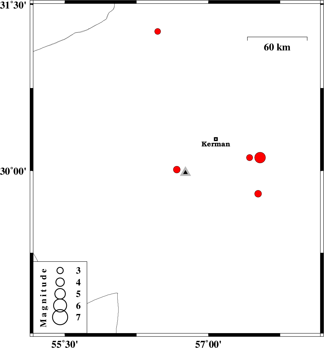 | 2011/06/26 | 09:50:28.0 | 14:20:28.0 | 29.79 | 57.52 | 9 | ML3.3 | Kerman Province, 70 km South-East of Kerman |