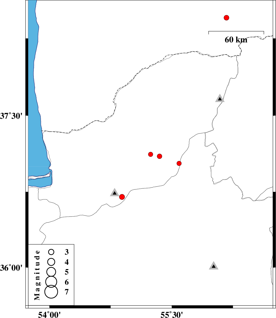 | 2011/06/16 | 07:03:19.4 | 11:33:19.4 | 36.7 | 54.89 | 15 | ML3 | Golestan Province, 23 km South of Ali Abad | ||