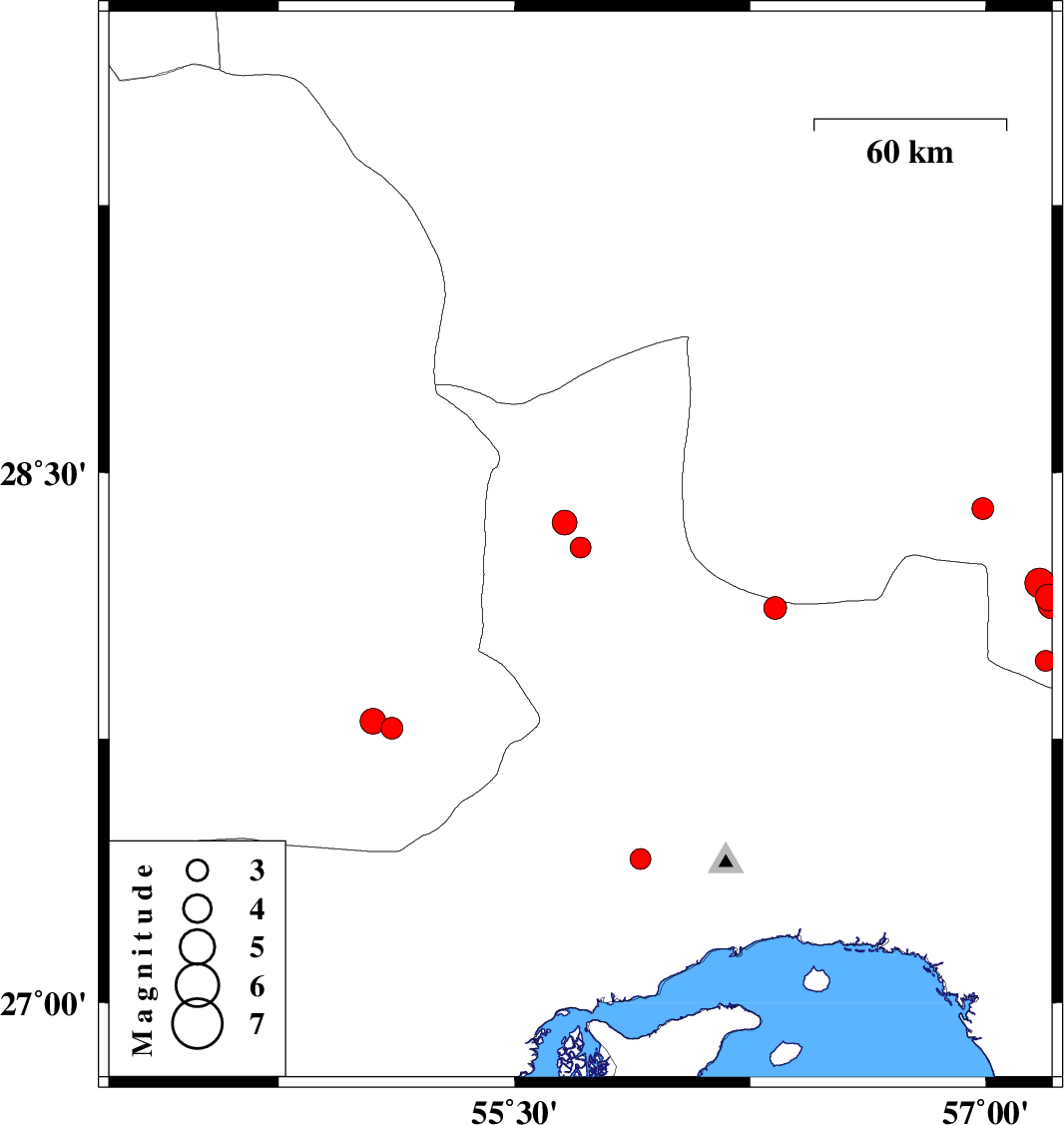 | 2011/06/29 | 10:20:51.4 | 14:50:51.4 | 27.78 | 55.11 | 15 | ML3.1 | Fars Province, 76 km North-East of Lar | ||