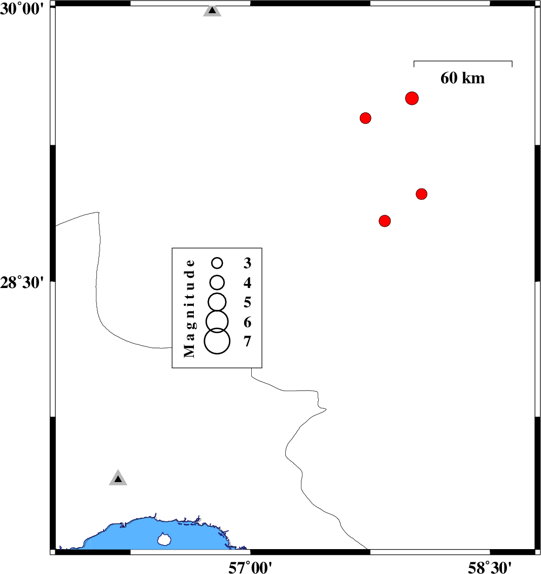 | 2011/07/04 | 07:46:27.2 | 12:16:27.2 | 27.93 | 58.67 | 14 | ML3.4 | Kerman Province, 96 km East of Kahnuj | ||