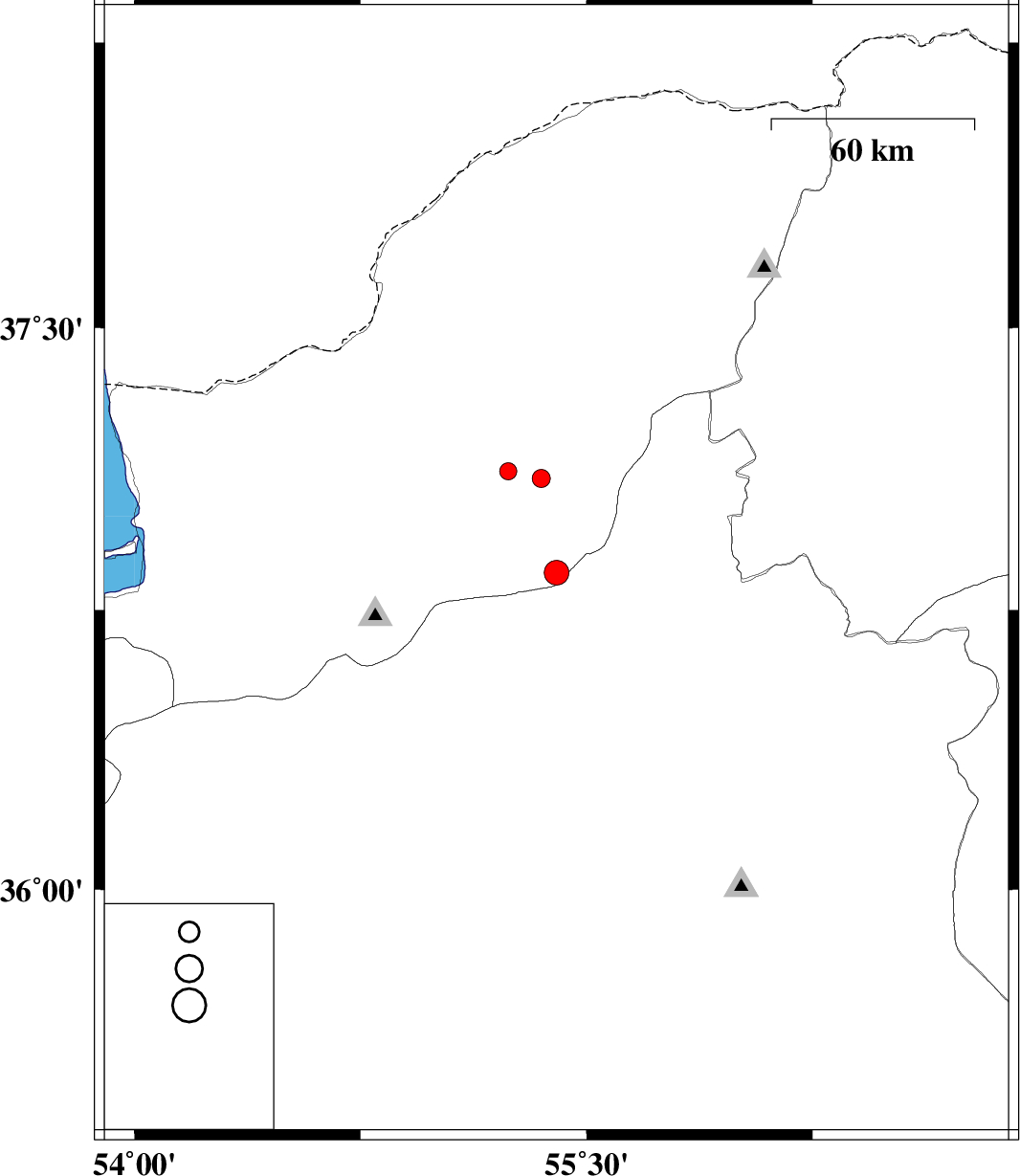 | 2011/07/23 | 04:09:40.0 | 08:39:40.0 | 36.85 | 55.4 | 6 | ML3.6 | Golestan Province, 43 km South of Minodasht | ||