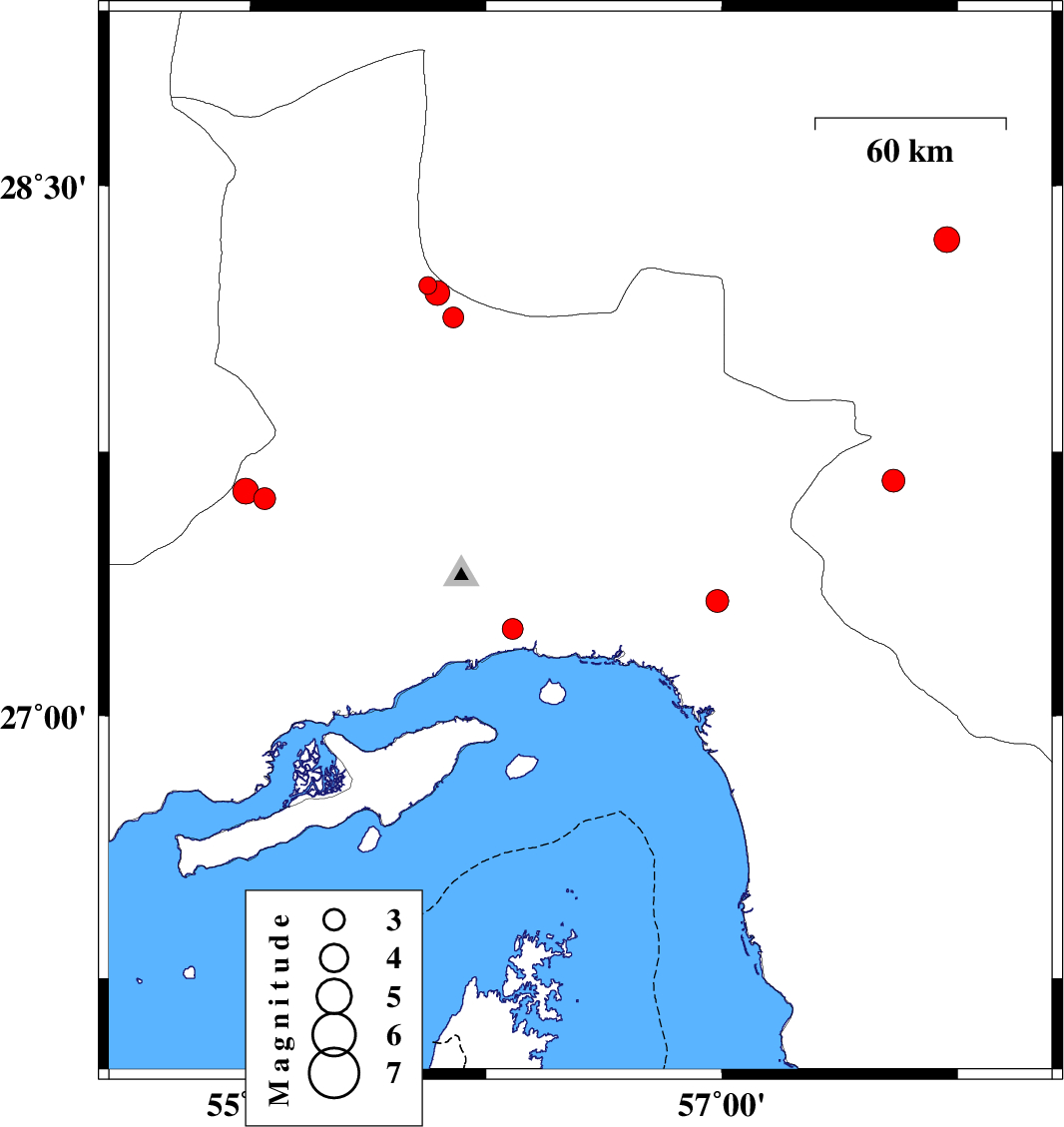 | 2011/06/26 | 19:01:35.4 | 23:31:35.4 | 27.41 | 55.9 | 14 | ML2.9 | Hormozgan Province, 45 km North-West of Bandar-e abbas |