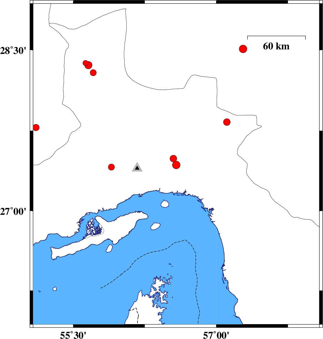 | 2011/07/10 | 06:20:01.9 | 10:50:01.9 | 28.36 | 55.66 | 18 | ML3.5 | Hormozgan Province, 24 km West of Hajiabad | ||