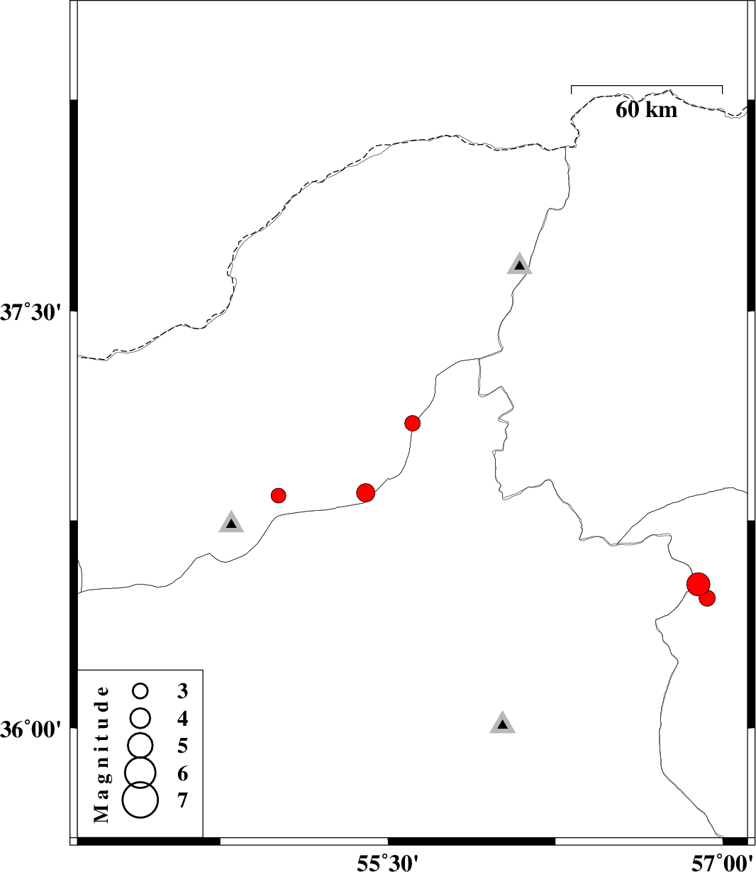 | 2011/07/23 | 04:09:40.0 | 08:39:40.0 | 36.85 | 55.4 | 6 | ML3.6 | Golestan Province, 43 km South of Minodasht |