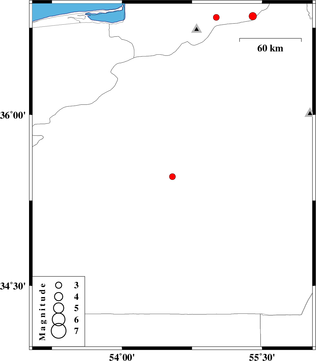 | 2011/07/23 | 04:09:40.0 | 08:39:40.0 | 36.85 | 55.4 | 6 | ML3.6 | Golestan Province, 43 km South of Minodasht |