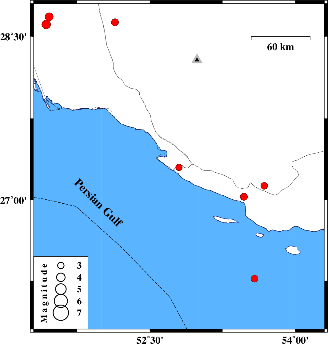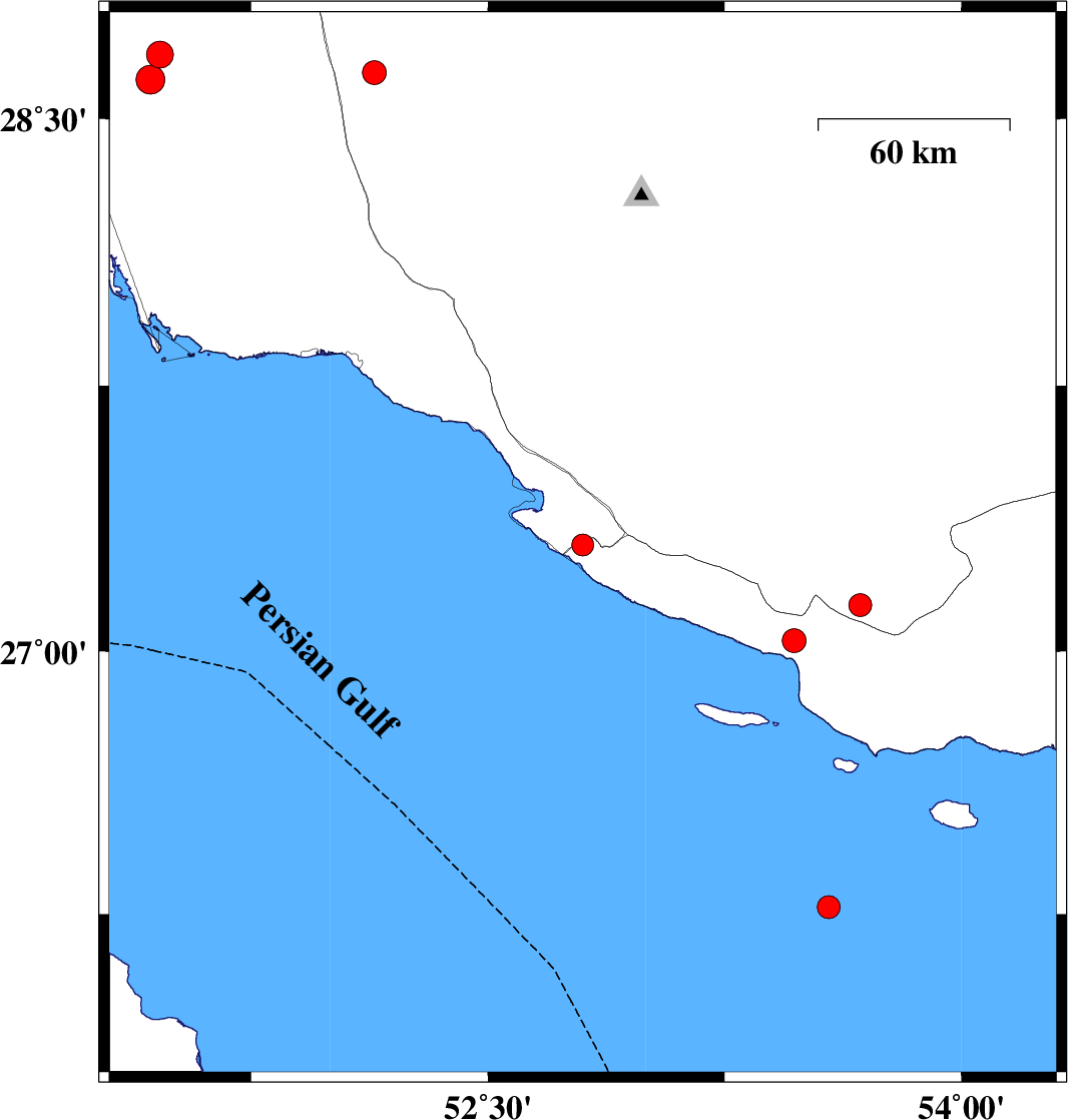 | 2011/07/02 | 01:10:40.2 | 05:40:40.2 | 28.68 | 51.46 | 30 | ML3.8 | Bushehr Province, 9 km Khormog | ||