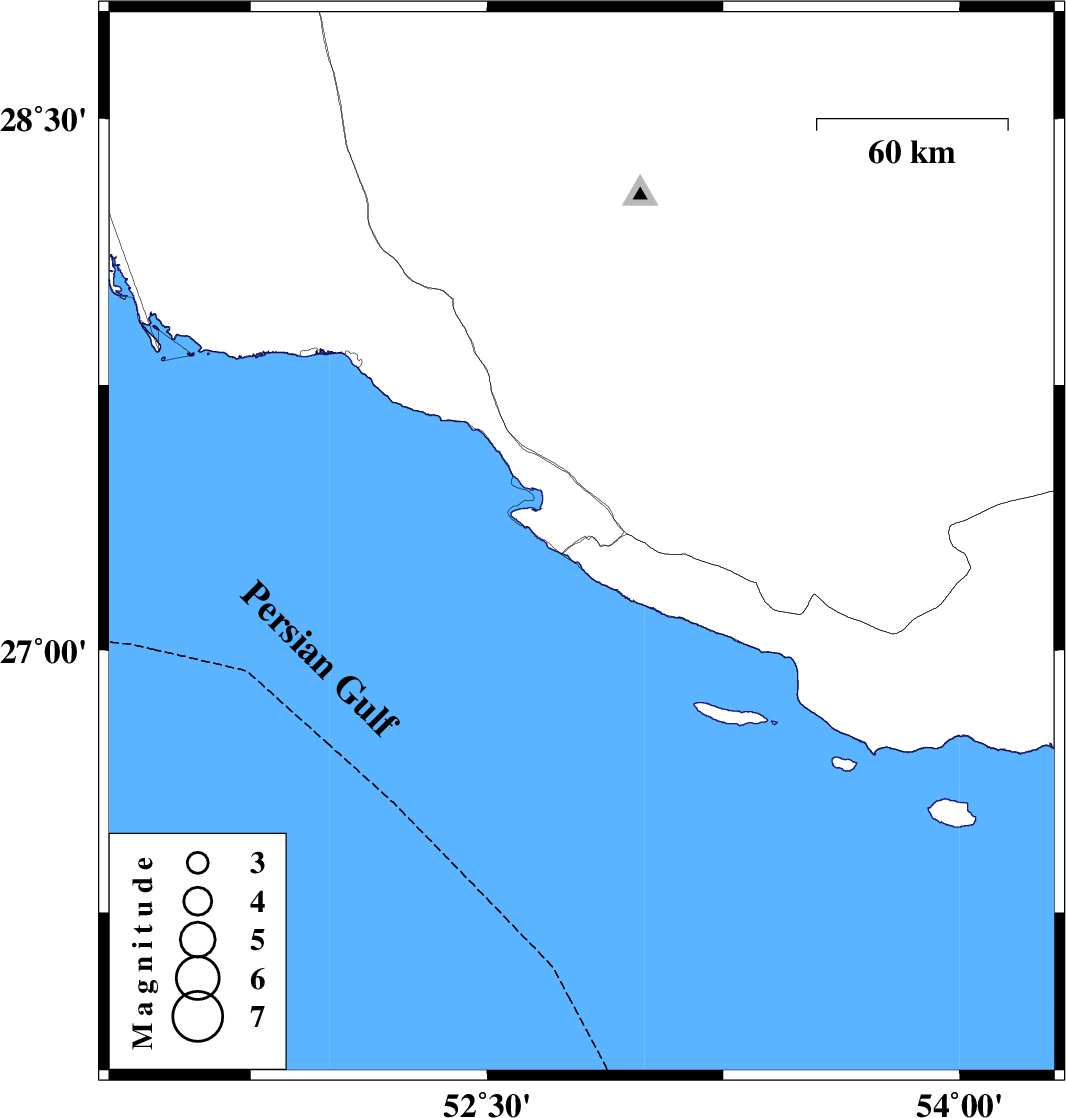 | 2011/07/30 | 20:34:42.7 | 01:04:42.7 | 27.3 | 52.8 | 15 | ML3.1 | Hormozgan Province, 29 km South of Mehr |