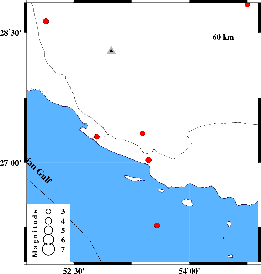 | 2011/08/02 | 02:13:54.6 | 06:43:54.6 | 27.34 | 53.39 | 14 | ML3 | Fars Province, 22 km East of Lamerd | ||