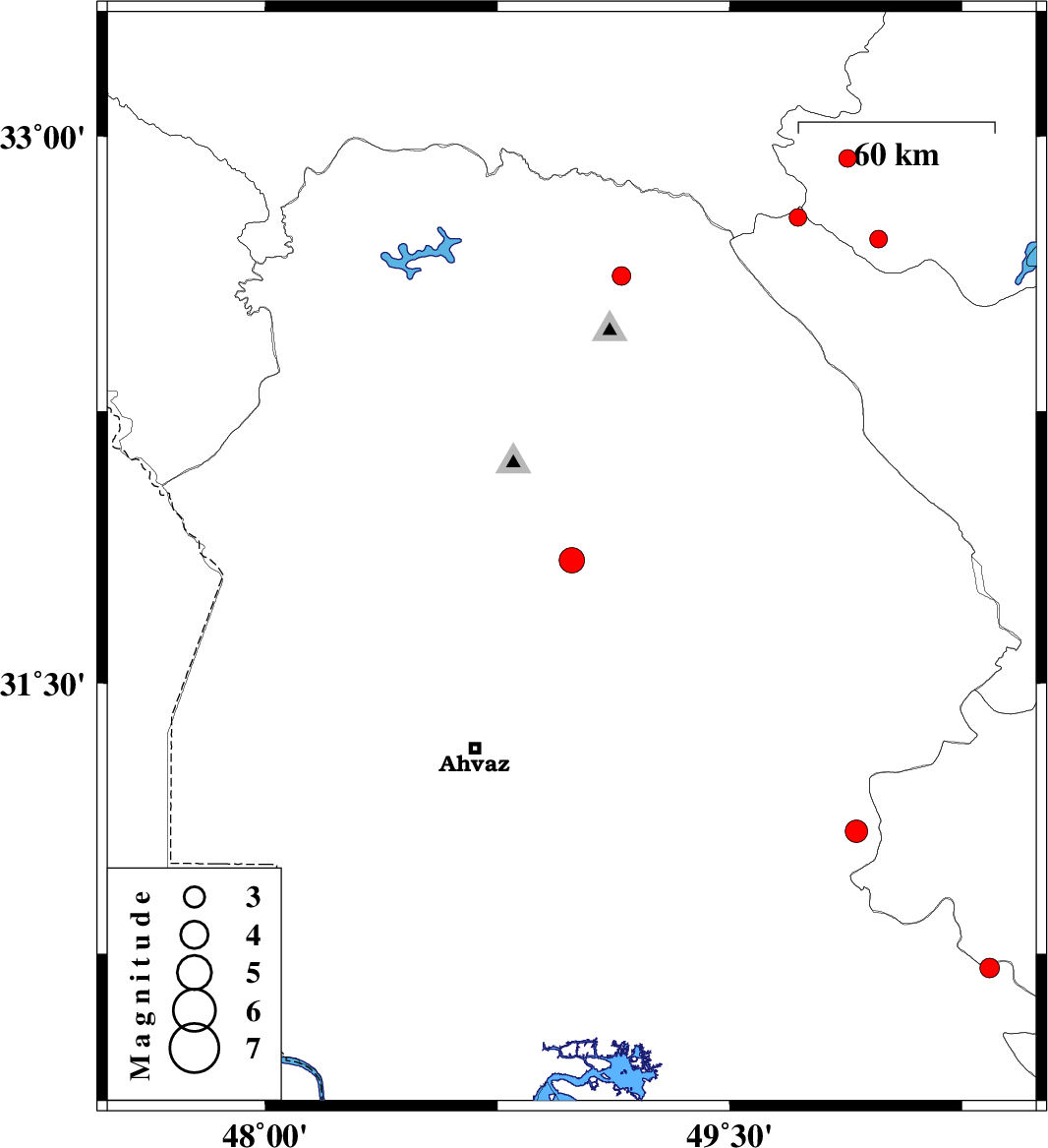 | 2011/08/04 | 01:54:37.6 | 06:24:37.6 | 31.09 | 49.91 | 14 | ML3.2 | Khoozestan Province, 47 km South of Bagh Malek | ||